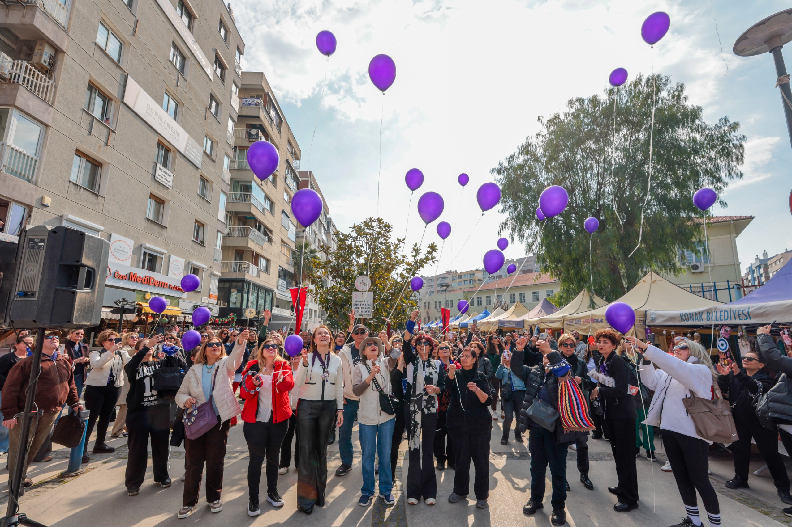 Etkinlik boyunca alanı dolduran kadınları bir an olsun yalnız bırakmayan Başkan Mutlu, hep bir ağızdan söylenen şarkılara dans ederek eşlik etti. Ayrıca daha eşit, özgür ve adil bir dünya dileğiyle mor balonlar gökyüzüne bırakıldı.